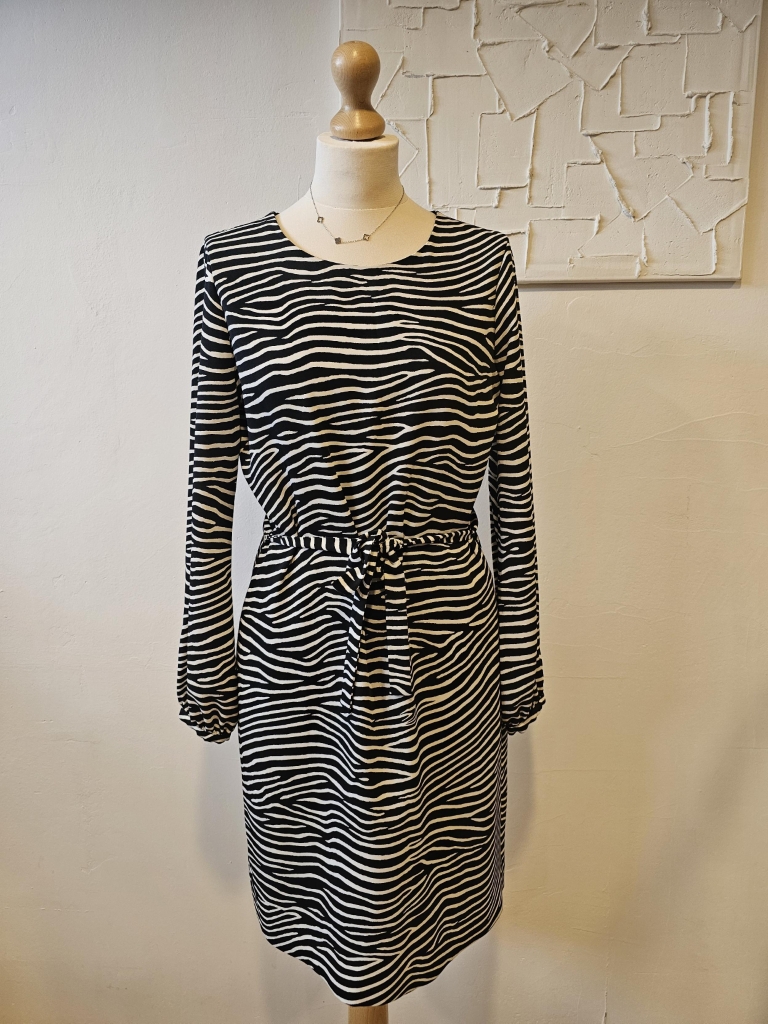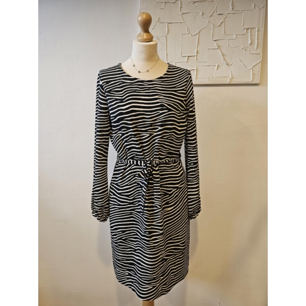 Claudia Sträter jurk in maat L met moderne zebra-print en strikceintuur. Elegant, comfortabel en tijdloos stijlvol.
