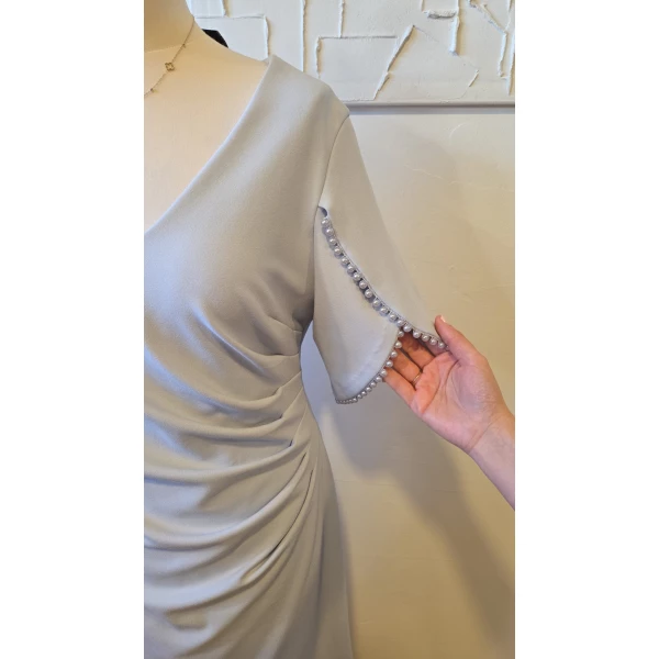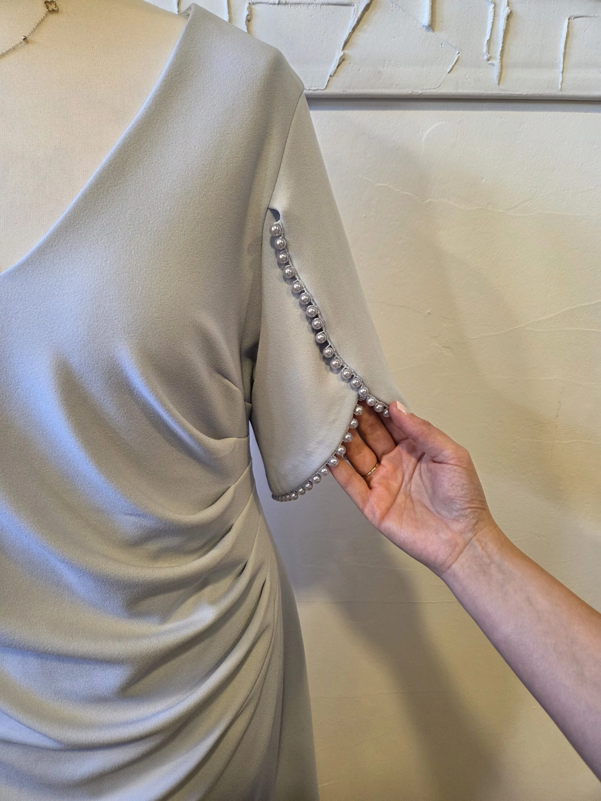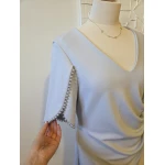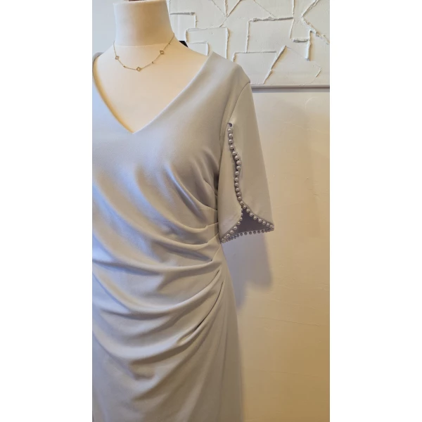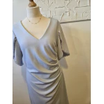 Lichtblauwe jurk van Joseph Ribkoff met V-hals, plooien aan de zijkant en mouwen met pareldetails. Een mooie jurk voor een feest of speciale gelegenheid. đŸ’™