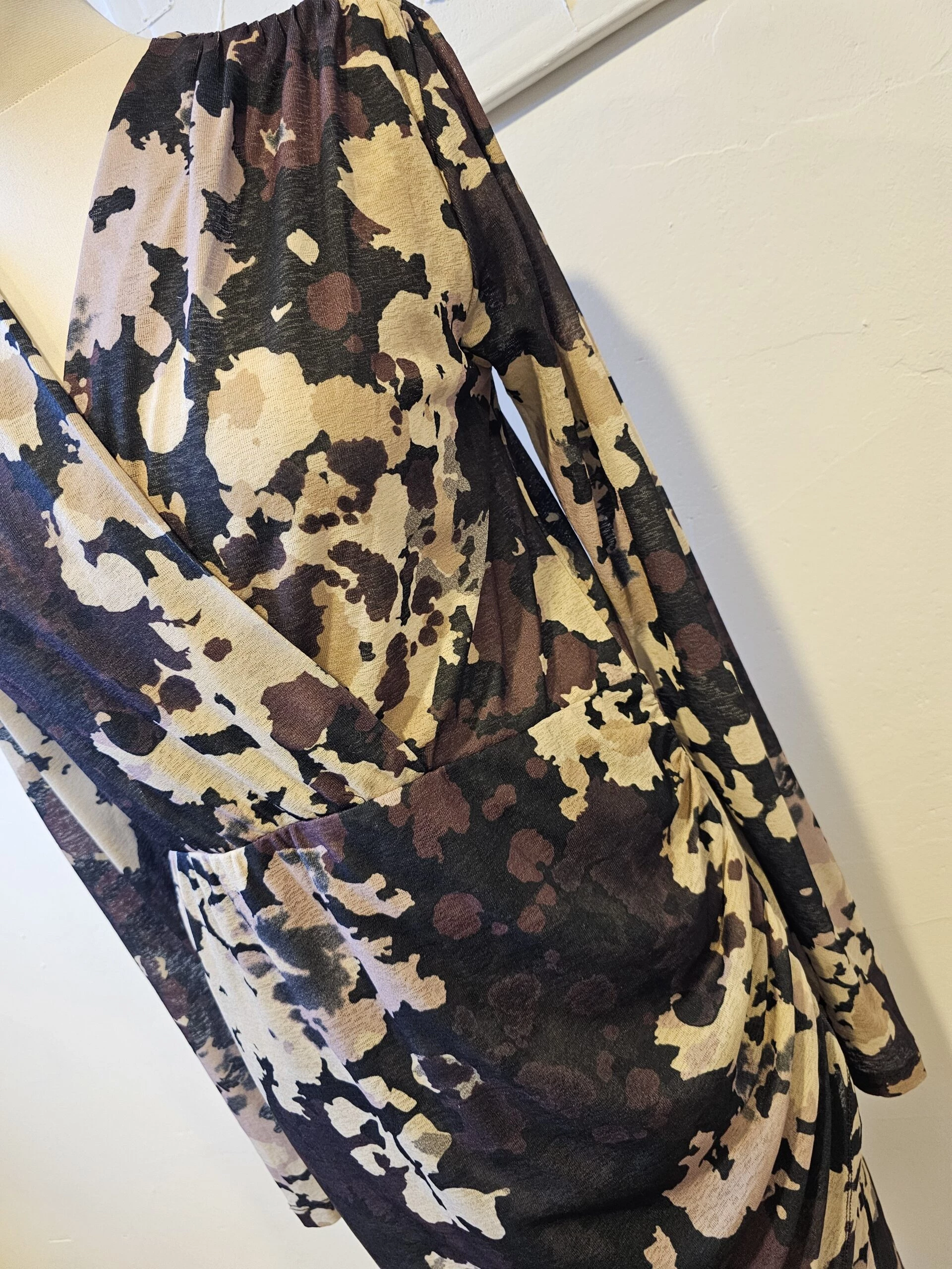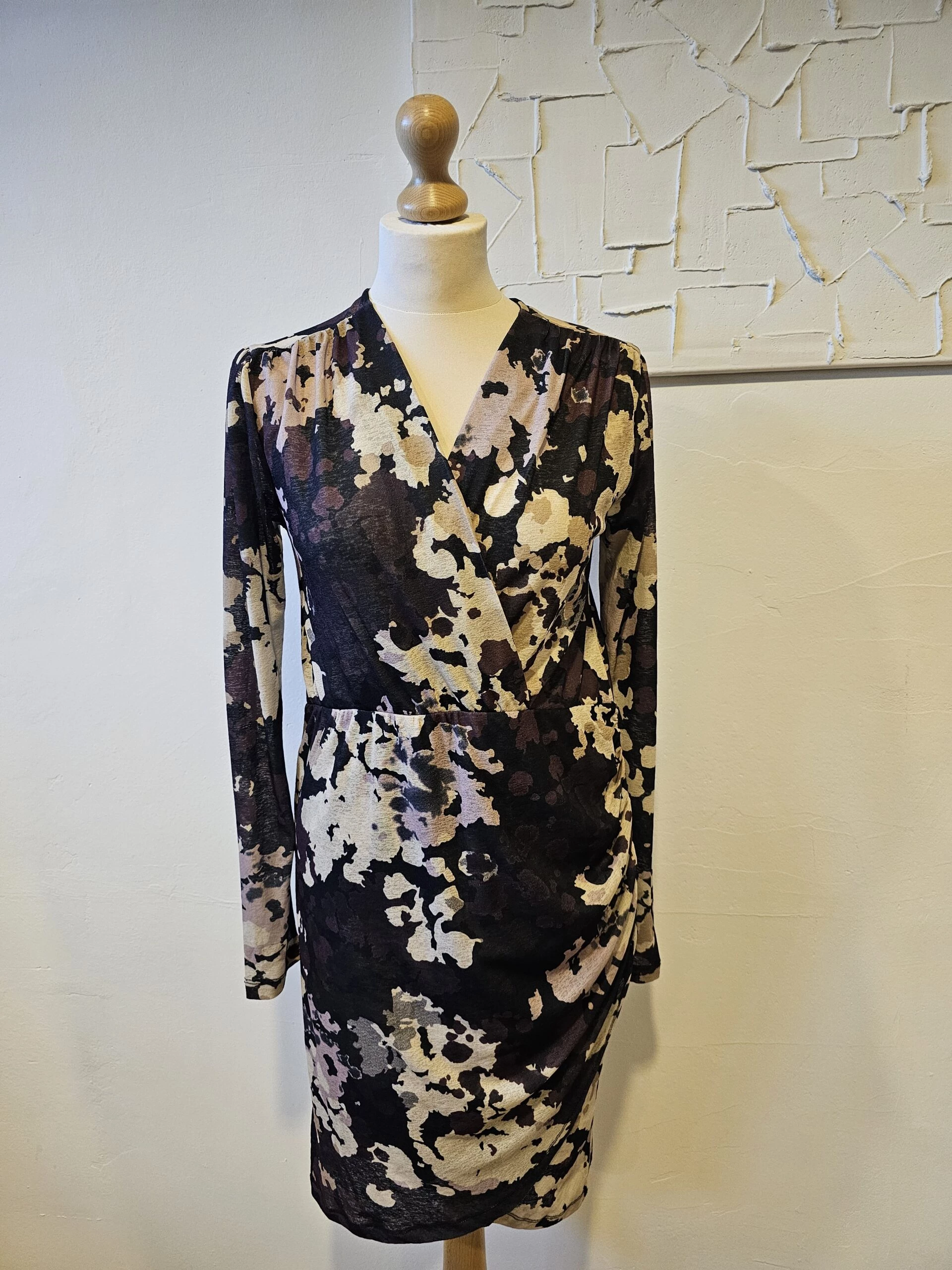 Chique overslagjurk met een elegante bloemenprint in warme tinten beige, paars en zwart. De aansluitende pasvorm en de subtiele plooien geven een vrouwelijke en stijlvolle uitstraling. Perfect voor een diner, feestje of een nette gelegenheid.